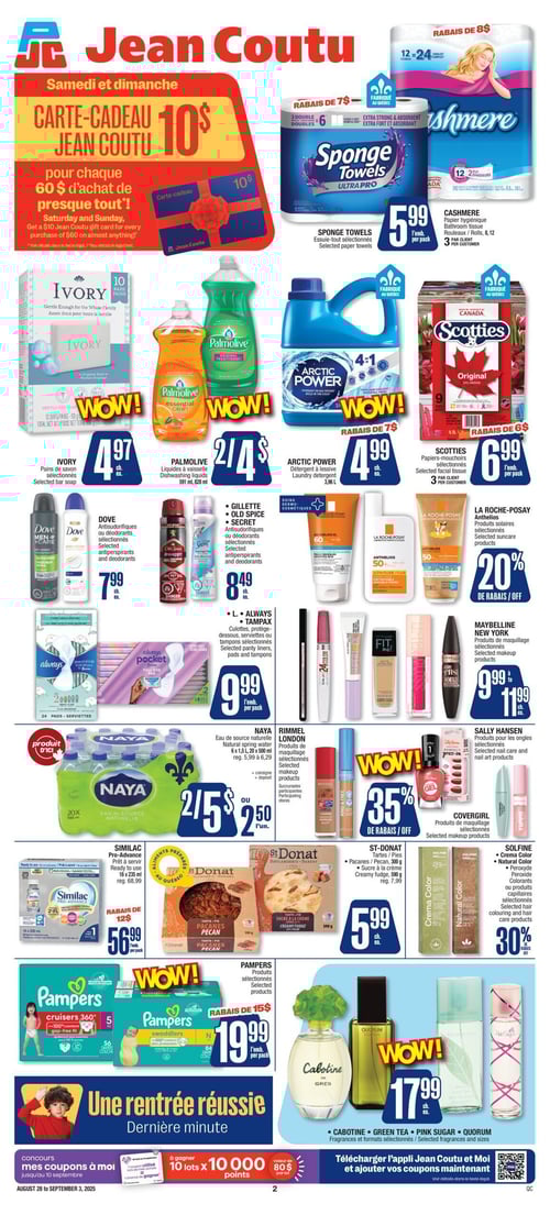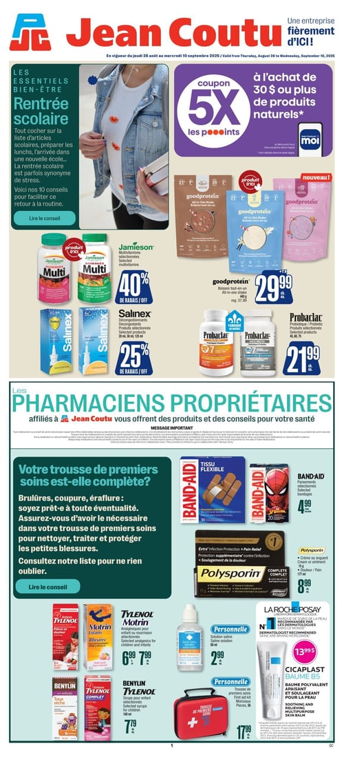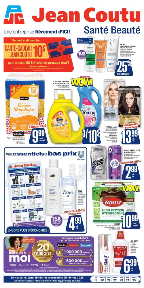 Consultez la plus récente circulaire en image de Jean Coutu, pour y découvrir tous leurs spéciaux de la semaine. De plus, vous avez aussi accès aux promotions sur tous les produits de soins de santé et de beauté.