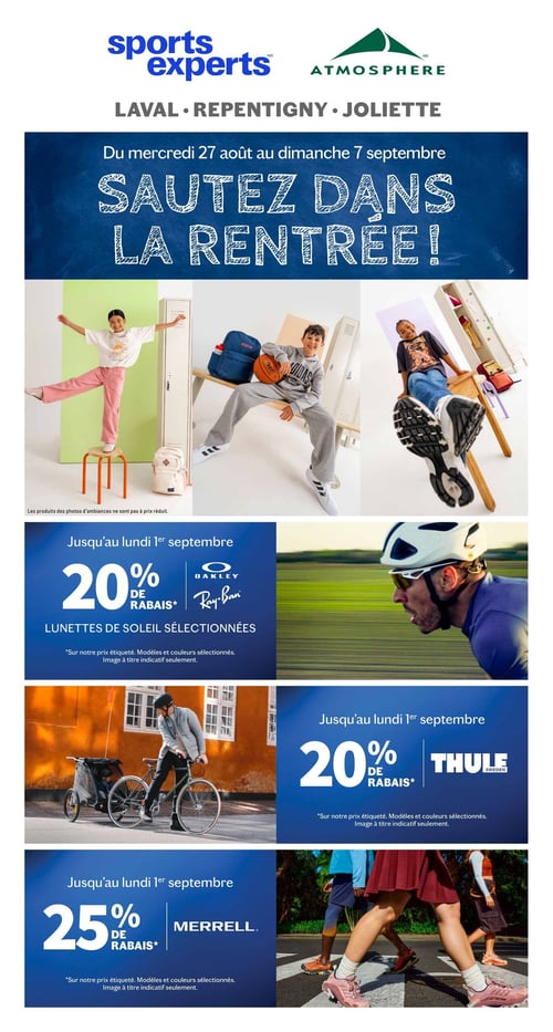 Consultez la plus récente circulaire en image de Sports Experts, pour y découvrir tous leurs spéciaux de la semaine. De plus, vous avez aussi accès aux promotions sur tous les vêtements, accessoires et équipements de sport.